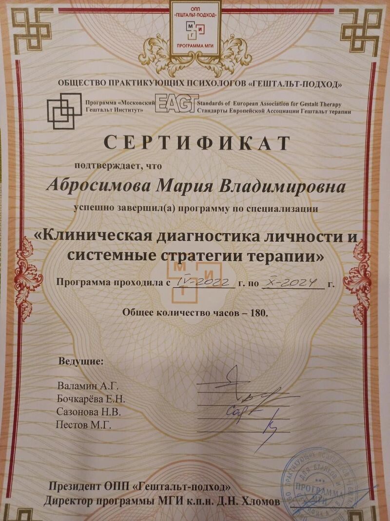 - ОПП «Гештальт-подход», Московский гештальт институт, программа «Клиническая диагностика личности и системные стратегии терапии», 2022–2024 гг.