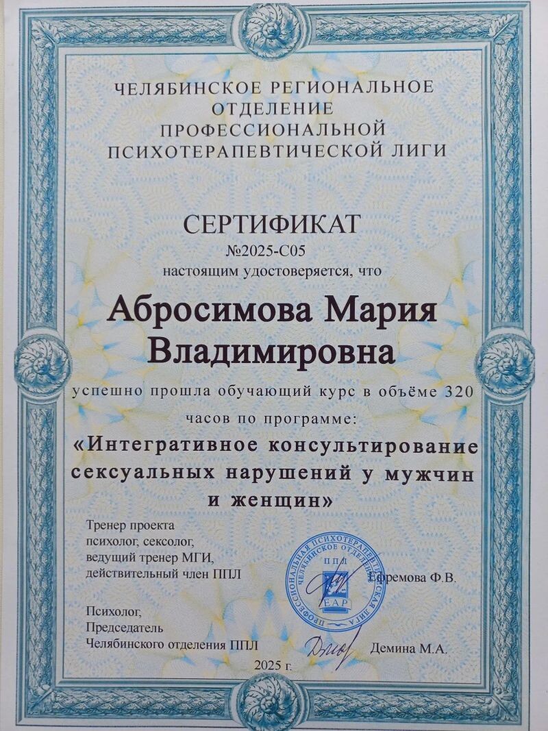 - Челябинское отделение ППЛ, программа «Интегративное консультирование сексуальных нарушений у мужчин и женщин», 2025 г.
