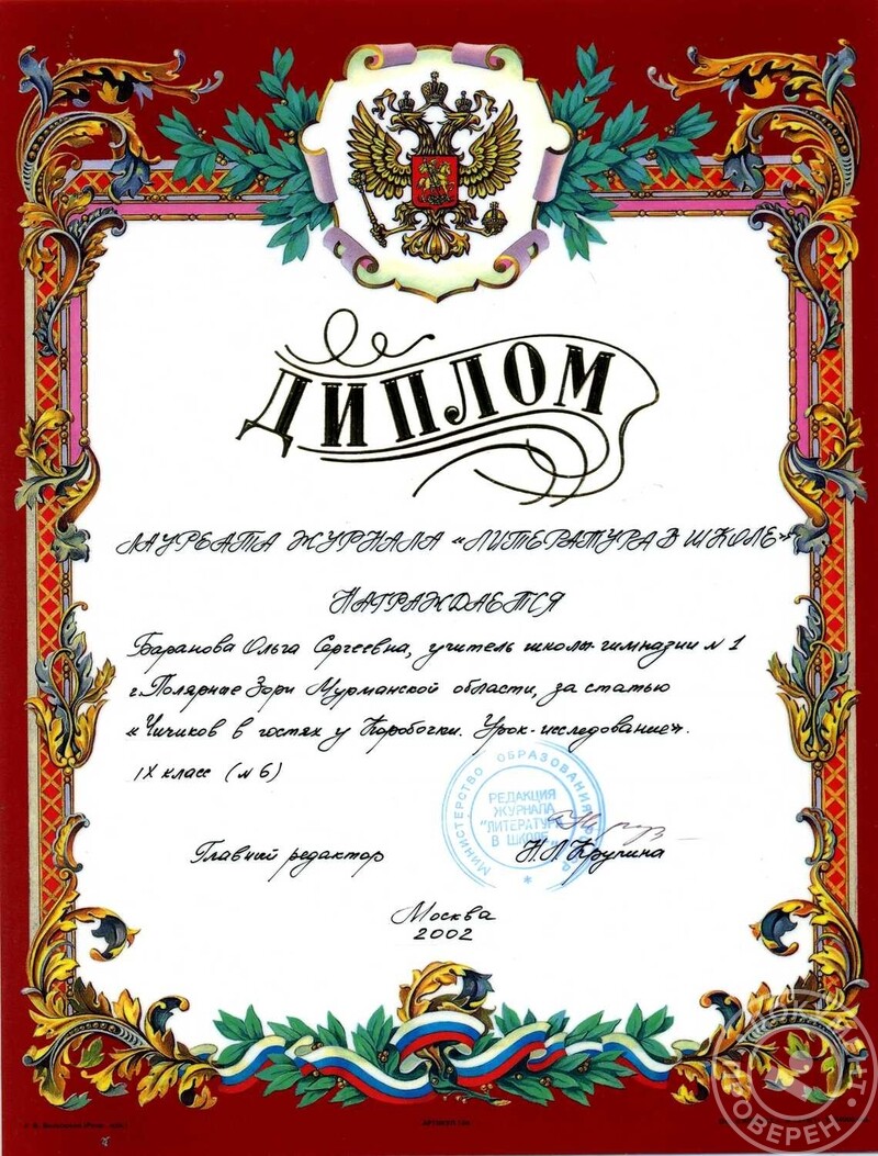 - Всероссийский конкурс методических разработок по произведениям Ф.М. Достоевского, диплом победителя, 2011 г.