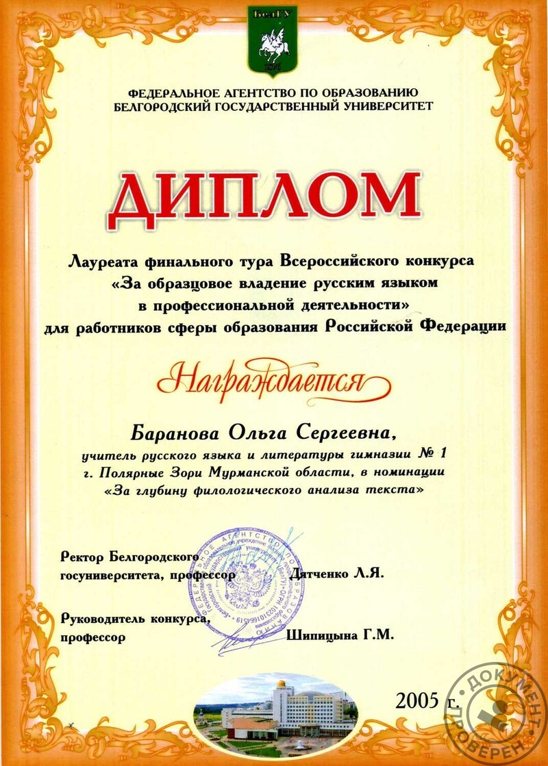 - Всероссийский конкурс «За образцовое владение русским языком в профессиональной деятельности» для работников сферы образования Российской Федерации, диплом лауреата финала в номинации «За глубину филологического анализа текста», 2005 г.