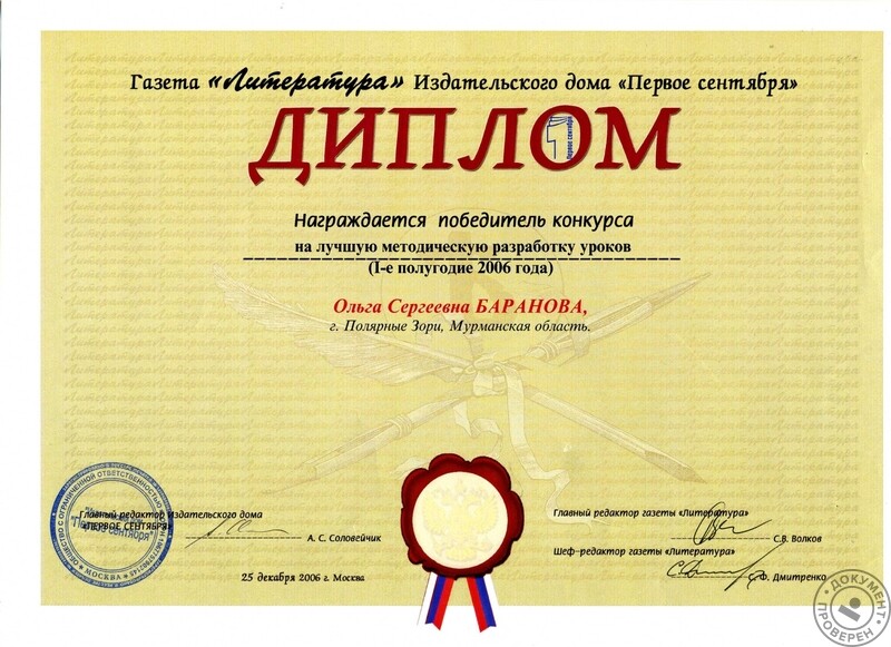 - Всероссийский конкурс для учителей литературы на лучшую методическую разработку уроков, победитель конкурса «Методическая разработка», 2006 г.