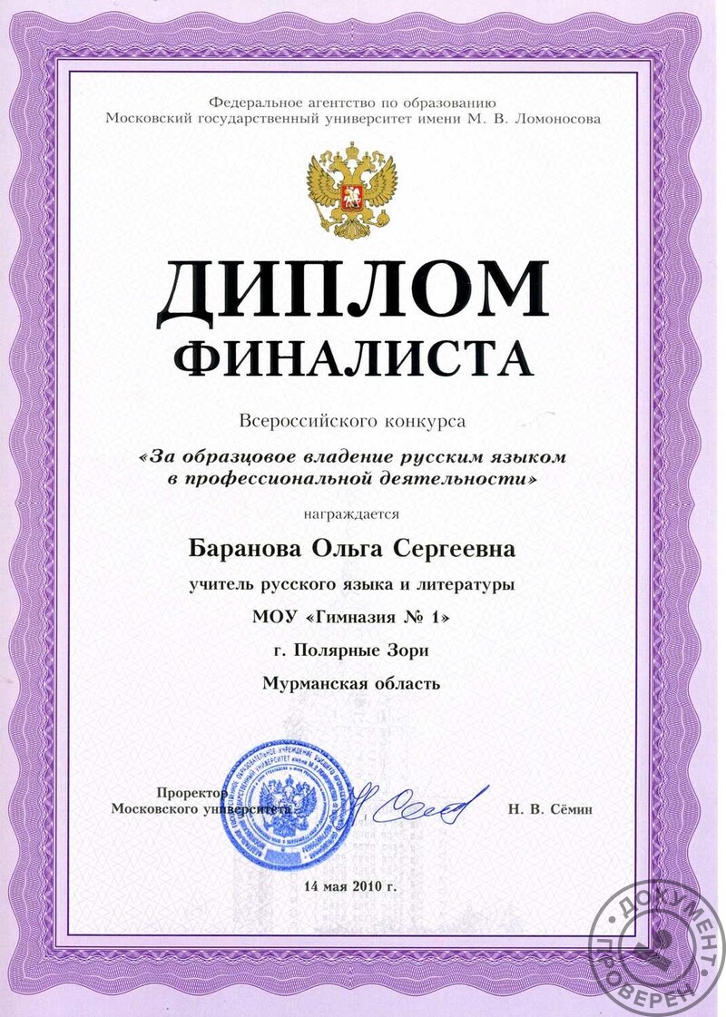 - Всероссийский конкурс «За образцовое владение русским языком в профессиональной деятельности», диплом финалиста, 2010 г.