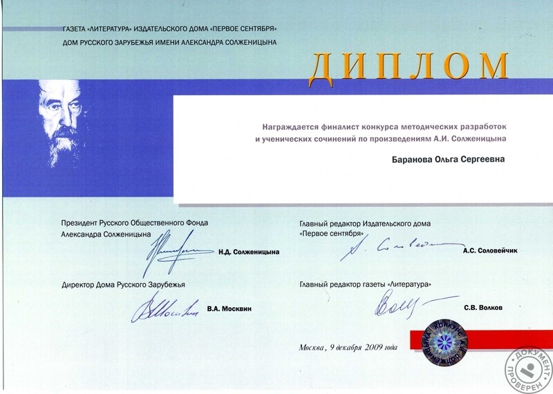 - Финалист всероссийского конкурса методических разработок по произведениям А.И. Солженицына, 2009 г.