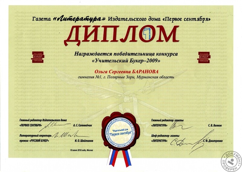 - Всероссийский конкурс «Учительский Букер», диплом победителя, 2009 г.