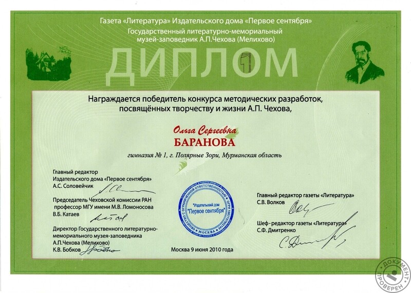 - Всероссийский конкурс методических разработок по произведениям А.П. Чехова, диплом победителя, 2010 г.