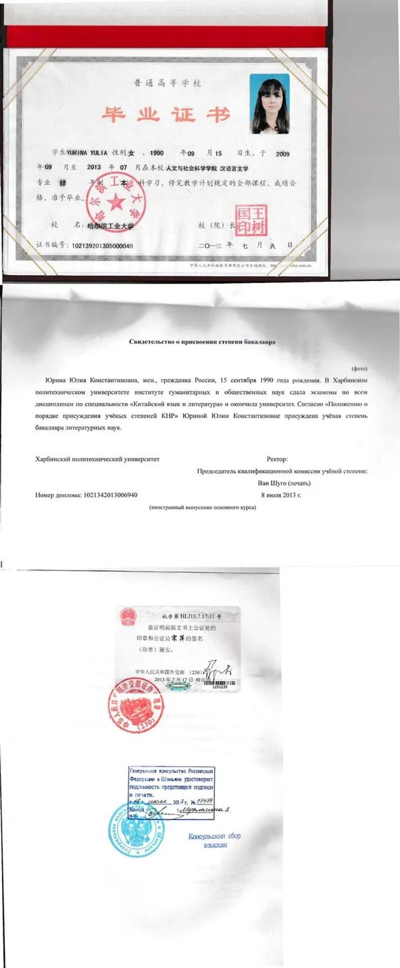 - Харбинский политехнический университет (Китай), филологический факультет, специальность – китайский язык и литература, 2009–2013 гг.