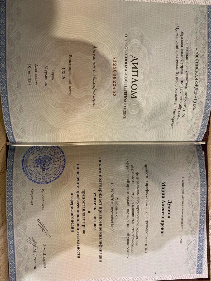 - Мурманский арктический государственный университет, логопед, 2020 г.