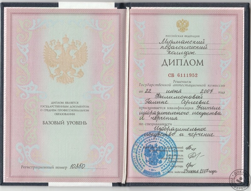 - Диплом Мурманского педагогического колледжа, специальность – учитель изобразительного искусства и черчения (2007 г.).