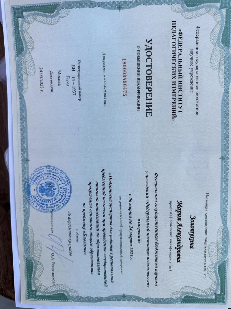 - Федеральный институт педагогических измерений, программа «Подготовка экспертов для работы в региональной предметной комиссии при проведении государственной итоговой аттестации по образовательным программам общего образования по предмету „Биология"», 2023 г.