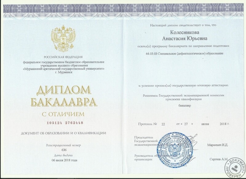 - Мурманский арктический государственный университет, специальное (дефектологическое) образование, бакалавр, 2014–2018 гг.