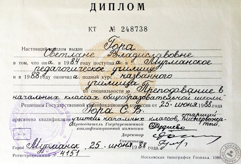 - Мурманское педагогическое училище, факультет преподавания в начальных классах, 1984–1988 гг.
