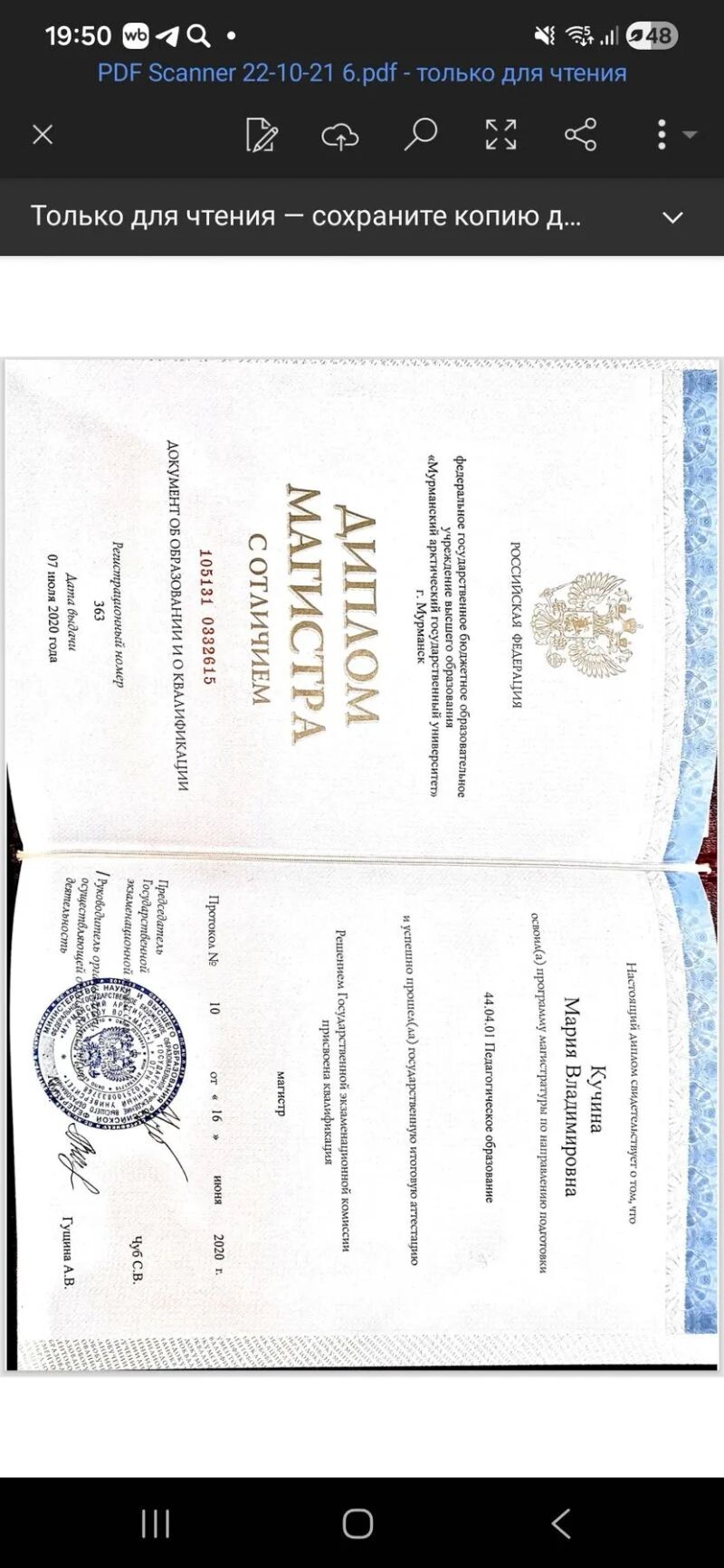 - Федеральное государственное бюджетное образовательное учреждение высшего образования "Мурманский арктический государственный университет", магистр. Педагогическое образование с двумя профилями подготовки (русский язык и литература), 2013–2020 гг.