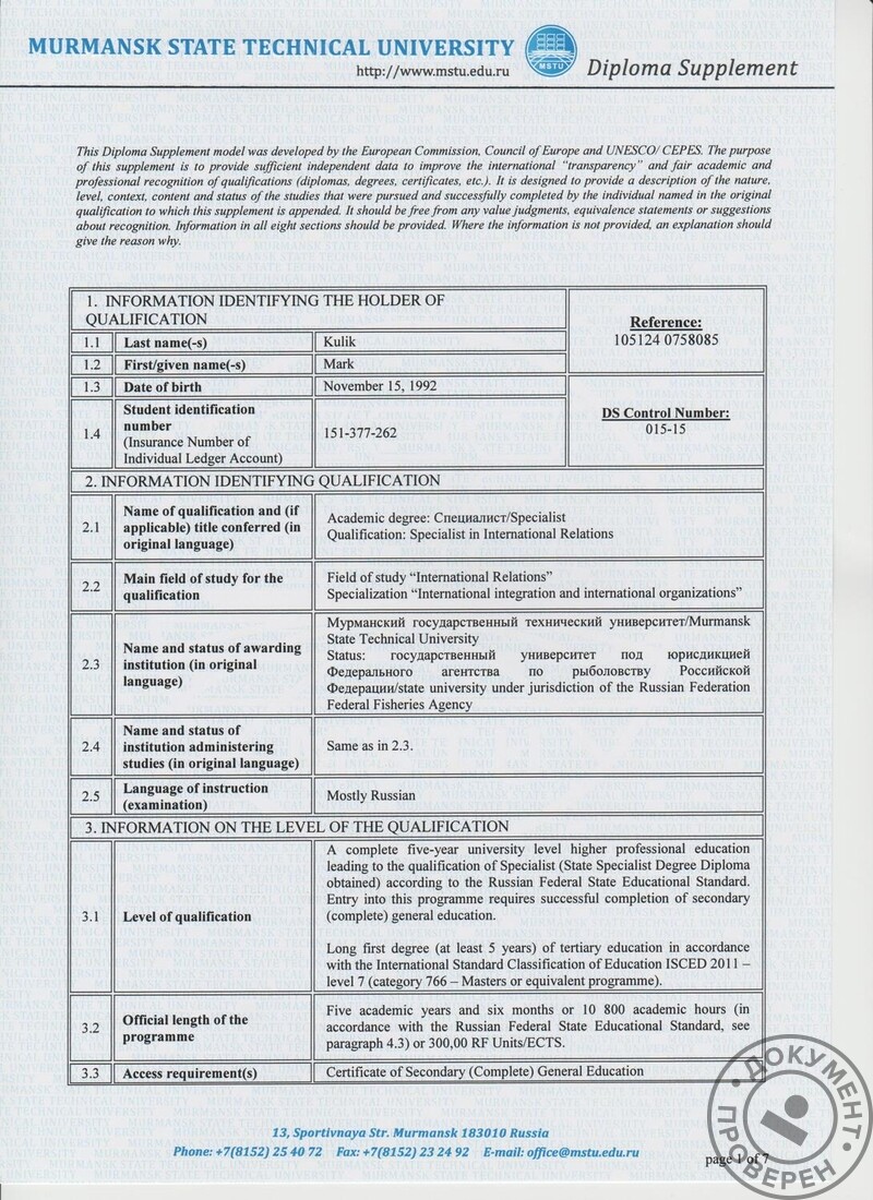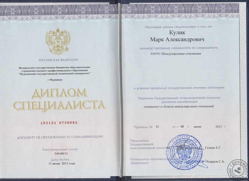 - Мурманский государственный технический университет, специальность – международные отношения, 2010–2015 гг.