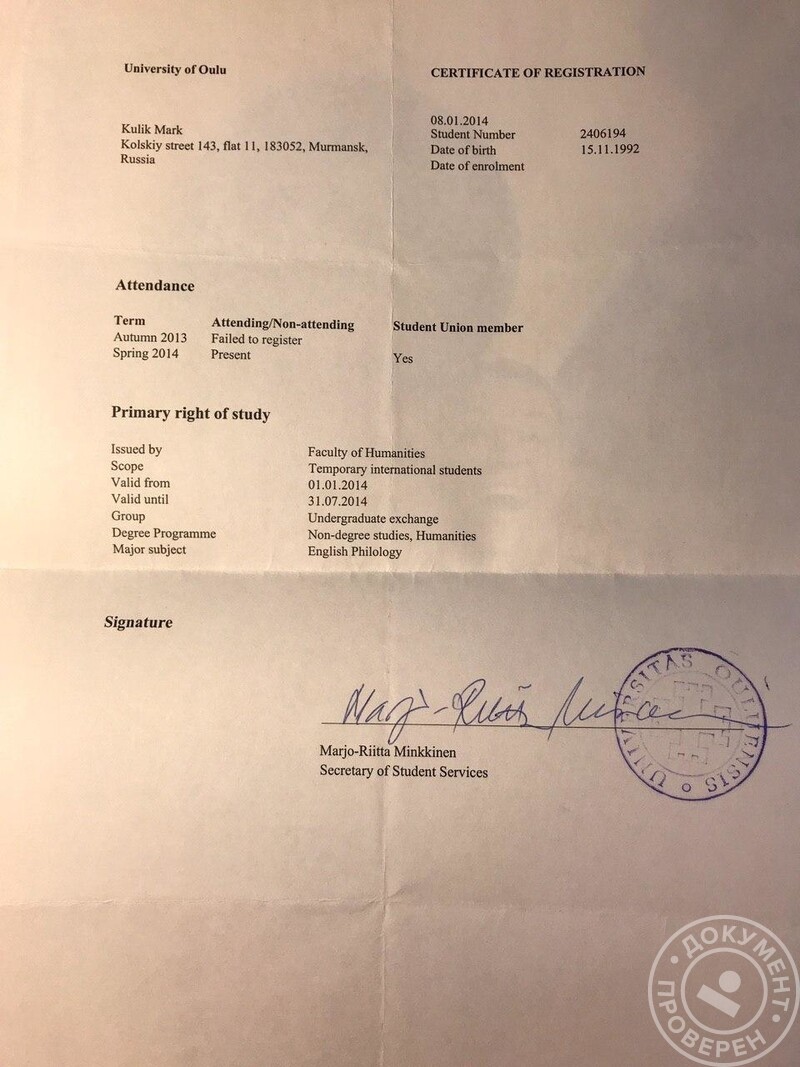 - Oulu University, English Philology and French language, Exchange Student, FIRST Program, 2014 г.