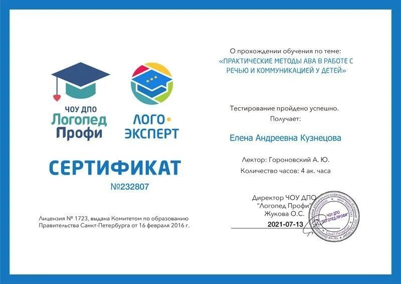 - ЧОУ ДПО «Логопед профи», практические методы АВА в работе с речью и коммуникацией у детей, 2021 г.