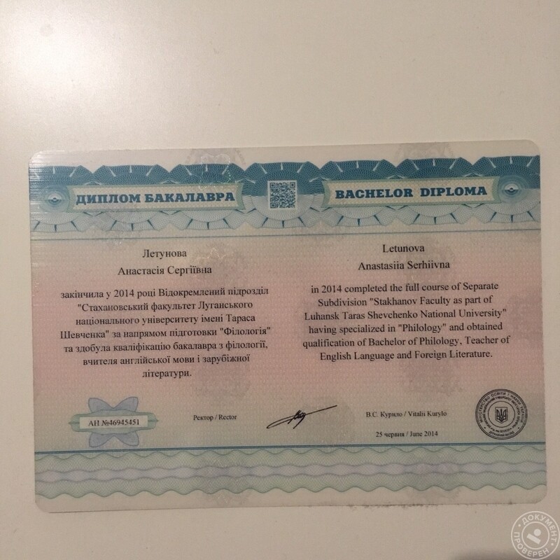 - ЛНУ им. Тараса Шевченко, факультет филологии, учитель английского языка и зарубежной литературы, 2012–2014 гг.