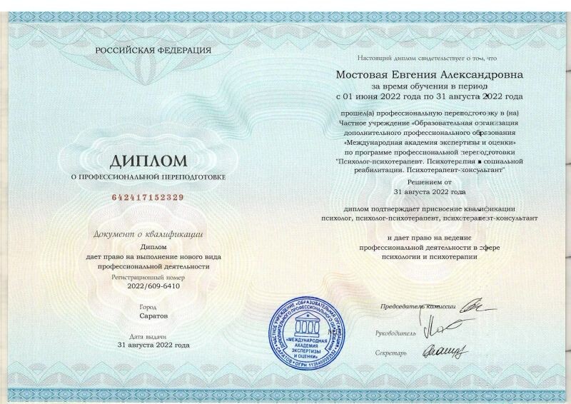 - Международная академия экспертизы и оценки, профессиональная переподготовка по программе «Психолог-психотерапевт. Психотерапия в социальной реабилитации. Психотерапевт-консультант», 2022 г.