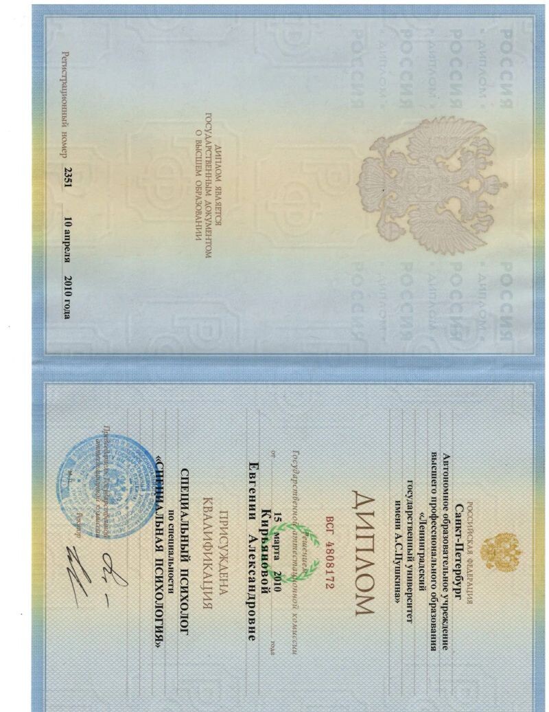 - Ленинградский государственный университет им. А.С. Пушкина, квалификация «специальный психолог», 2010 г.