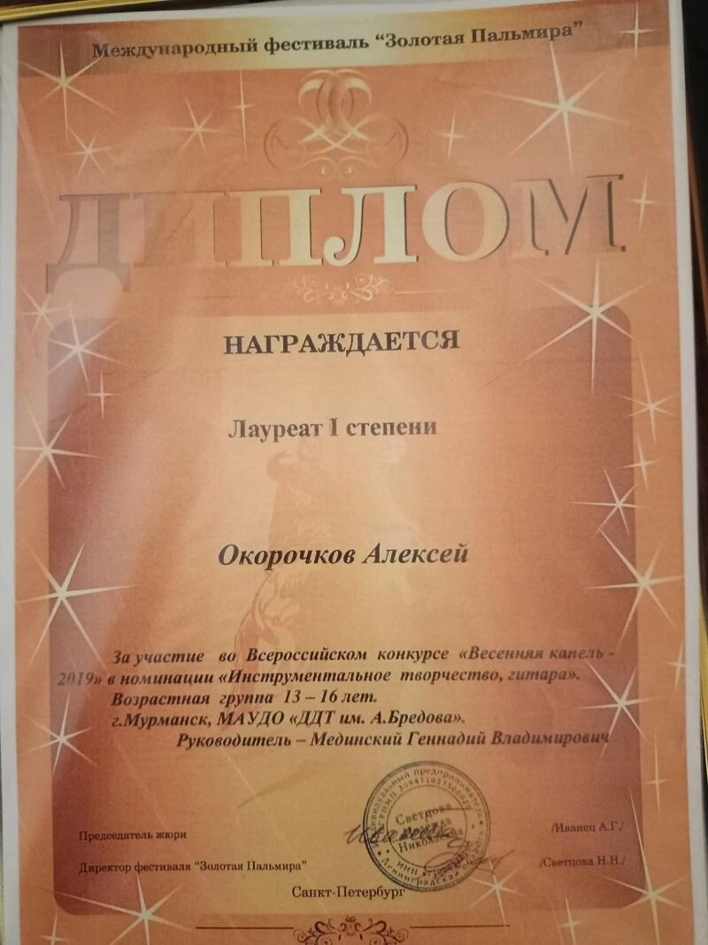 - Лауреат 1 степени международного музыкального фестиваля "Золотая Пальмира" (с 2019 г.).