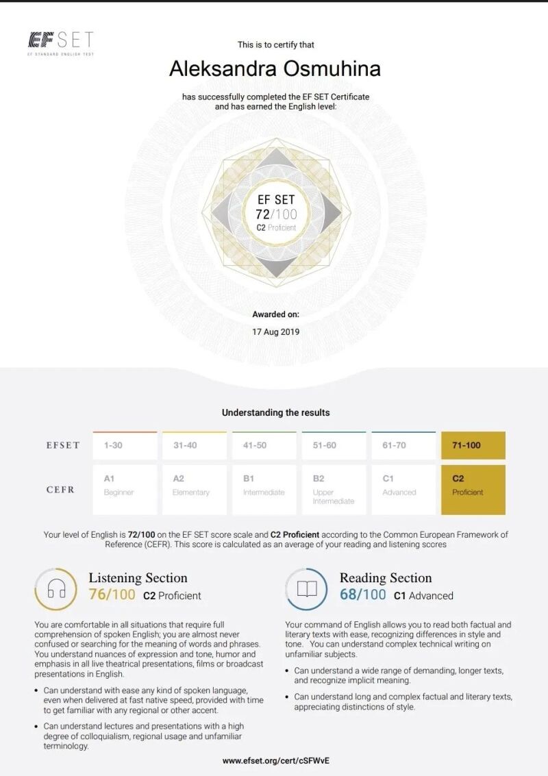 - Институт развития образования, удостоверение о повышении квалификации по программе «Развитие качества образовательной деятельности по иностранному языку в условиях введения и реализации ФГОС общего образования с модулем», 2018 г.