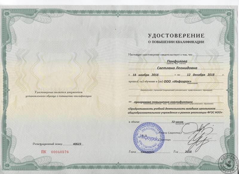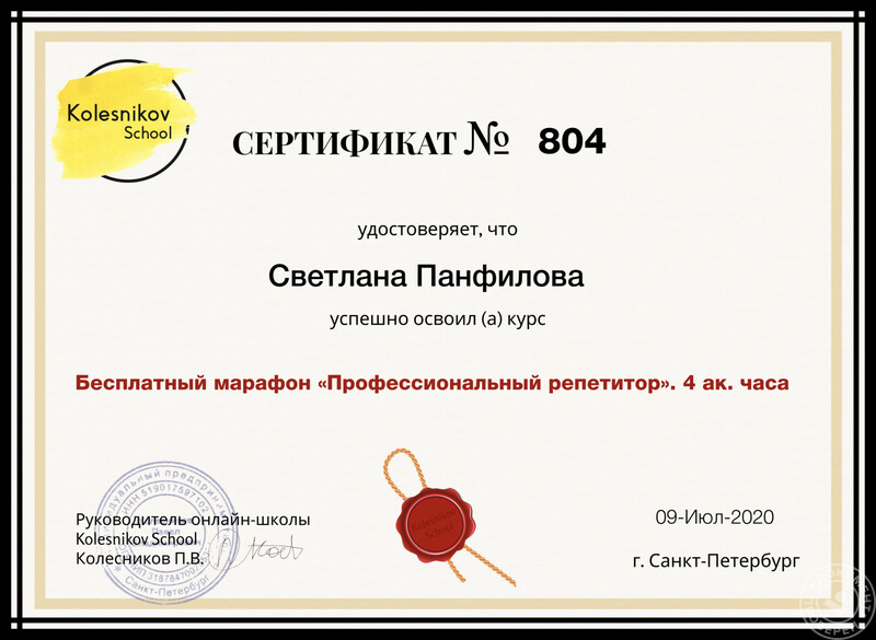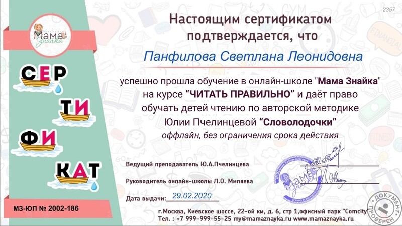 - Онлайн-школа «Мама Знайка», сертификат на право обучать детей чтению по авторской методике Юлии Пчелинцевой «Словолодочки», 2020 г.