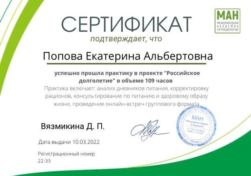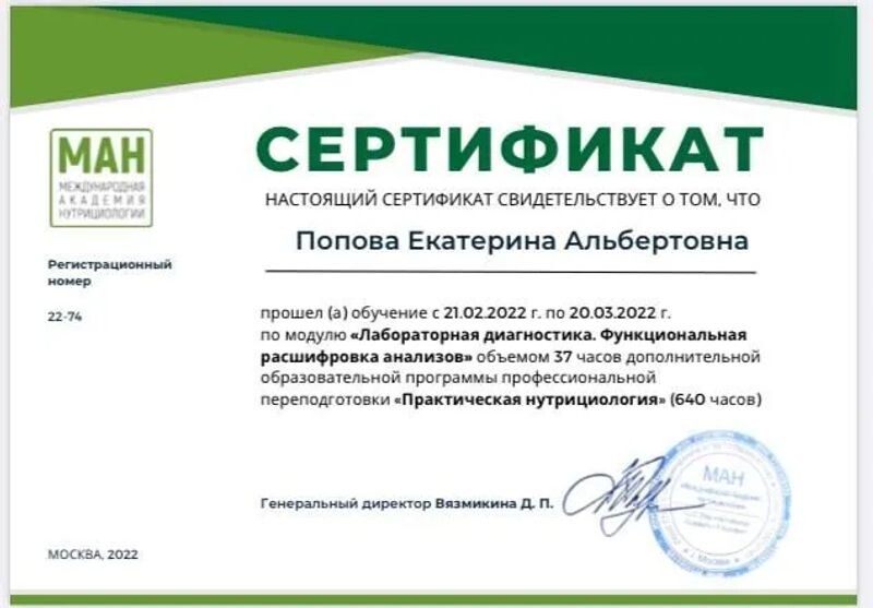- Международная академия нутрициологии, лабораторная диагностика, функциональная расшифровка анализов, 2021–2022 гг.