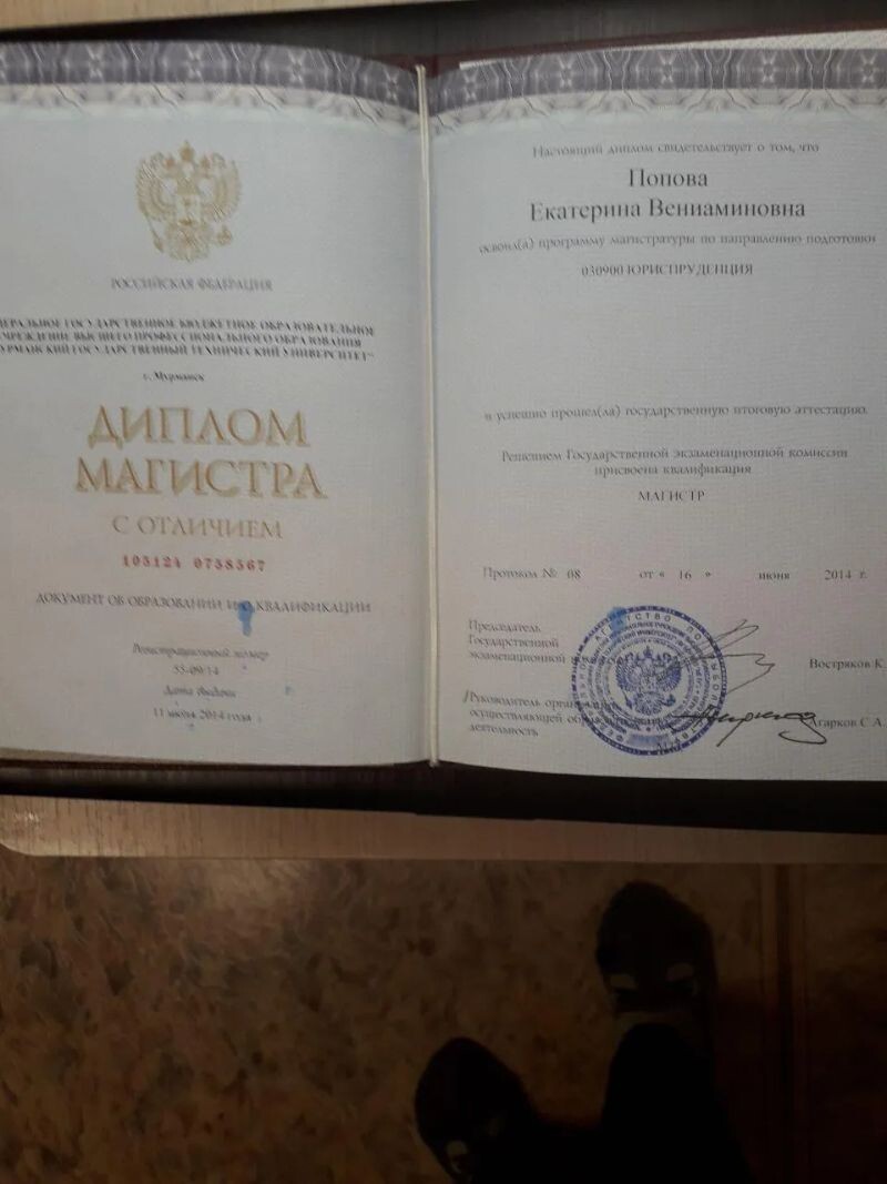 - ФГБОУ ВПО «Мурманский государственный технический университет», юриспруденция, 2012–2014 гг.