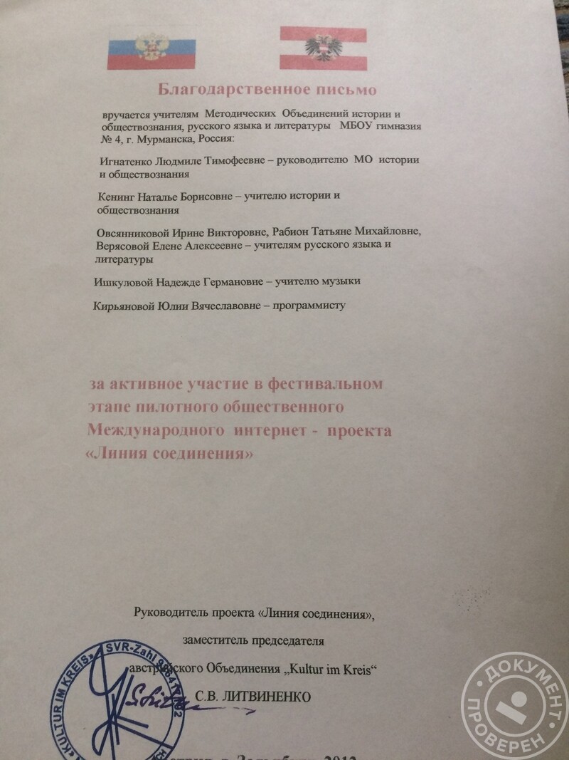 - Диплом за международное сотрудничество (Австрия-Россия, 2012 г.).