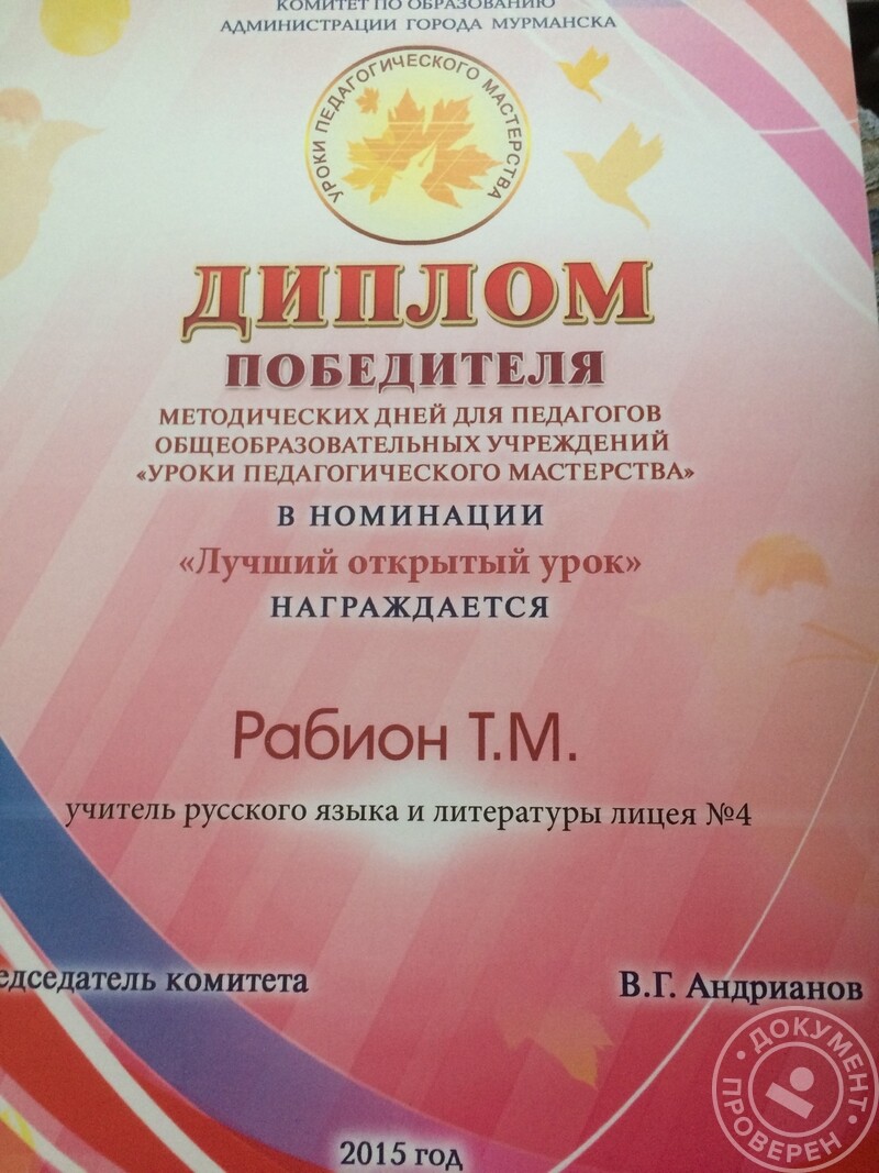 - Конкурс «Неделя педмастерства», победитель; конкурс «Учитель города – 2016», финалист.