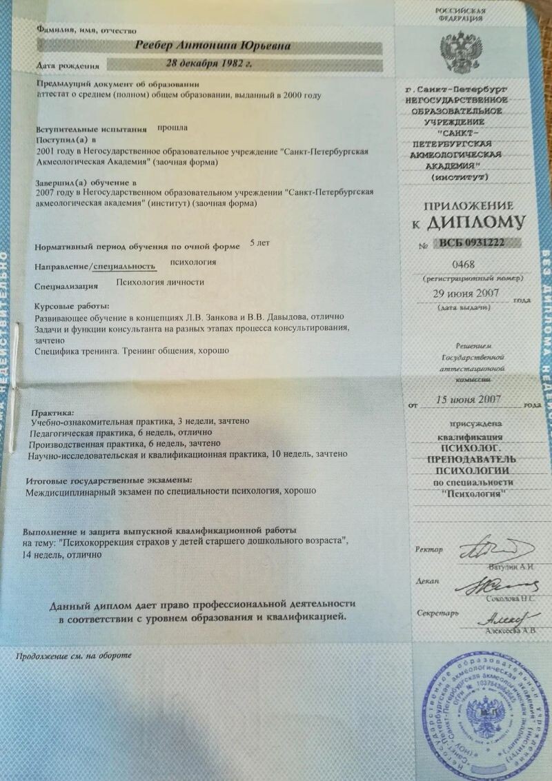 - Санкт-Петербургская акмеологическая академия (институт), психология личности, психолог, преподаватель психологии, 2001–2007 гг.