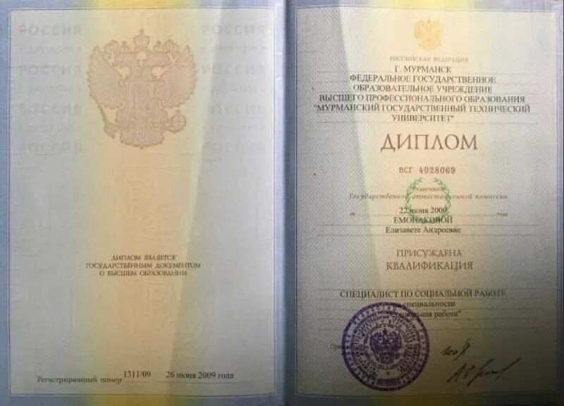 - Мурманский государственный технический университет, специалист по социальная работе, 2004–2009 гг.