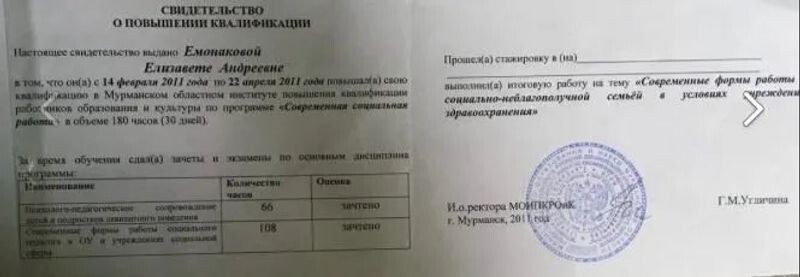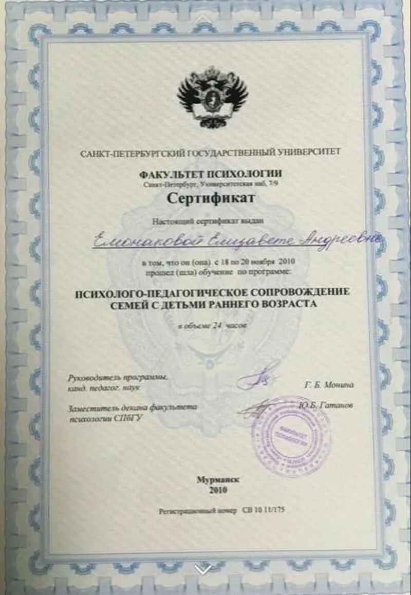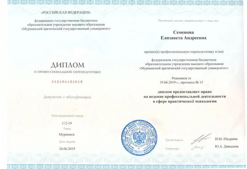- Мурманский арктический государственный университет. Специальность – практическая психология. Диплом о профессиональной переподготовке, 2018–2019 гг.