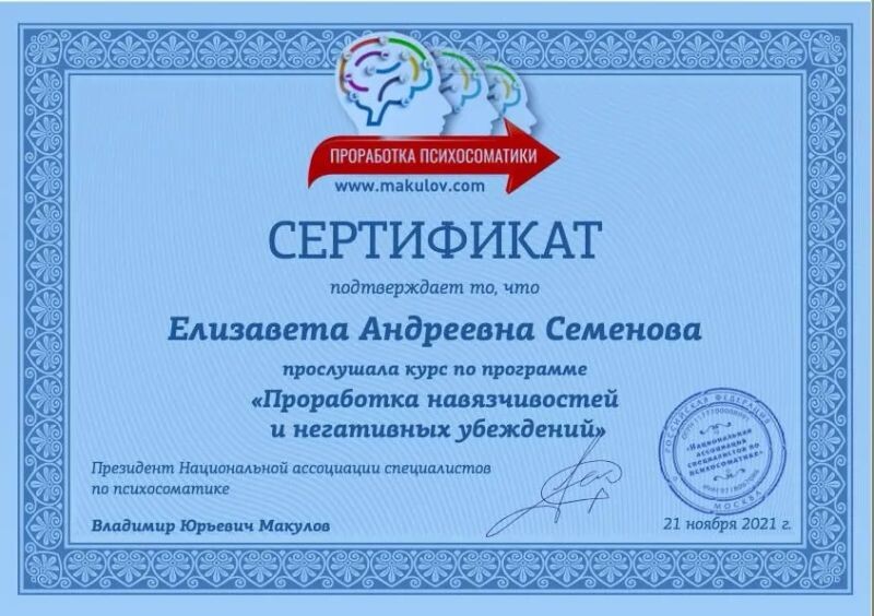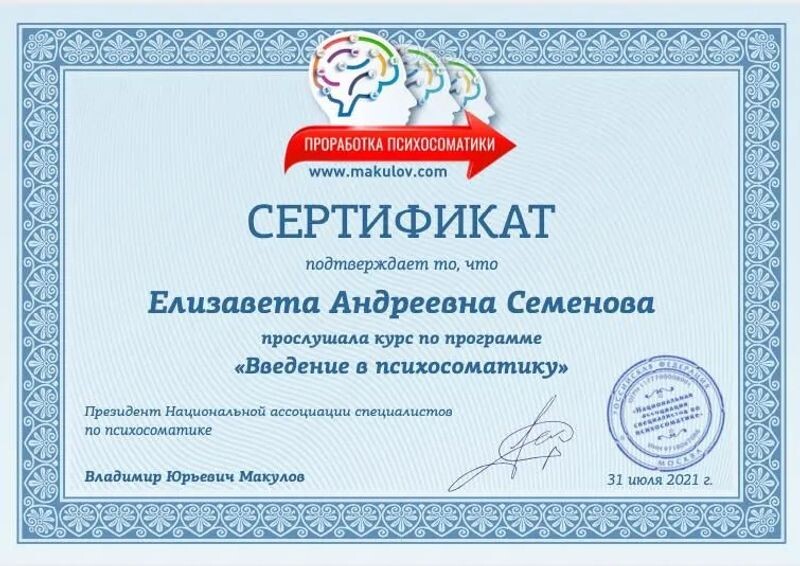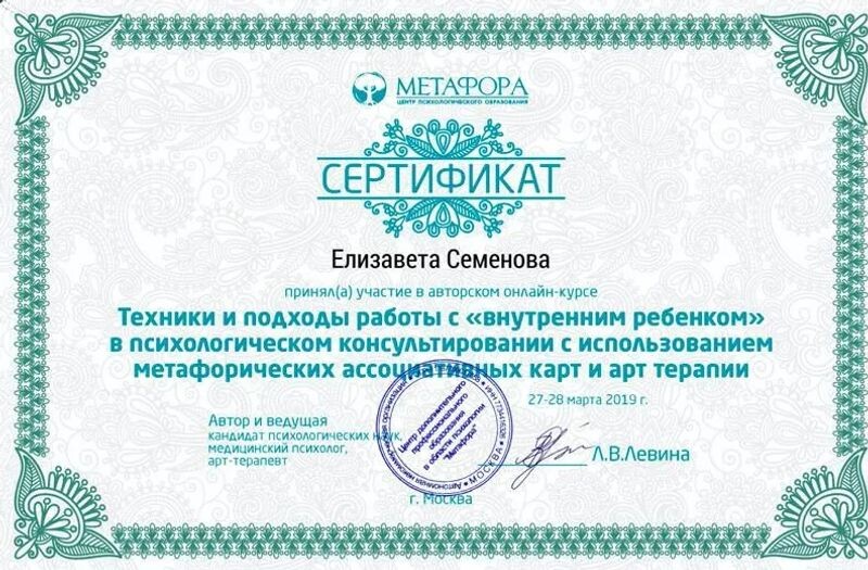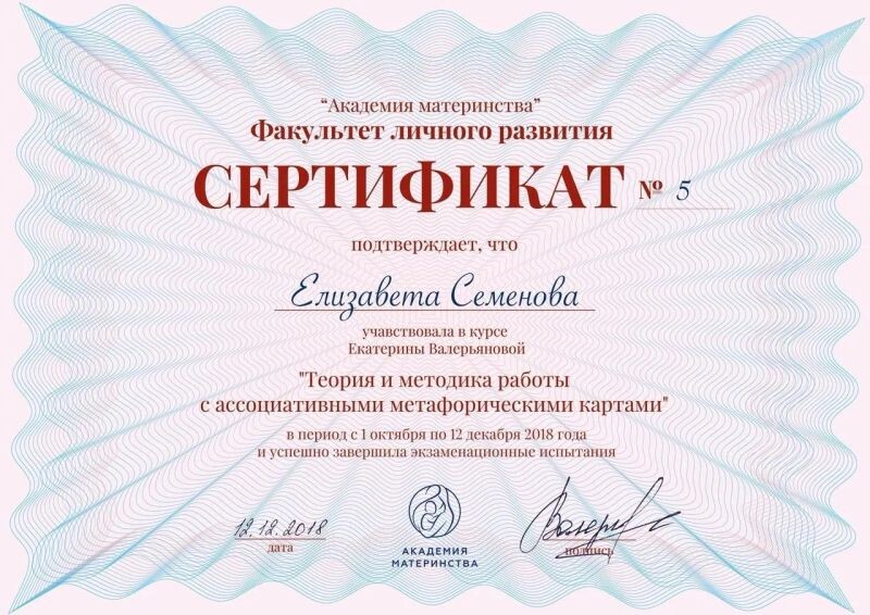 - Курс «Теория и методика работы с ассоциативными метафорическими картами», 2018 г.