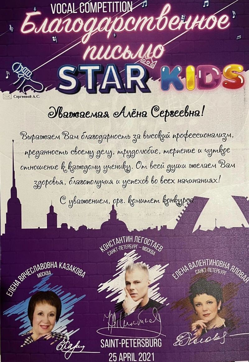 - Благодарственное письмо за подготовку ученика к международному вокальному конкурсу «Star kids», 2021 г.