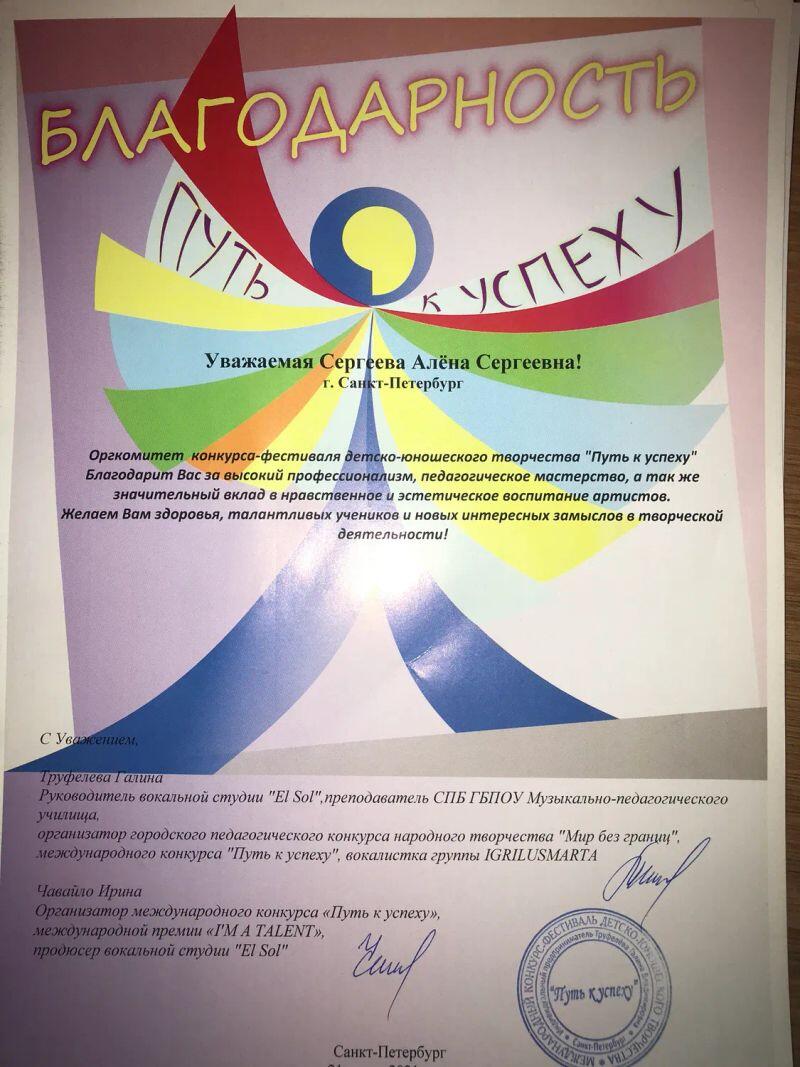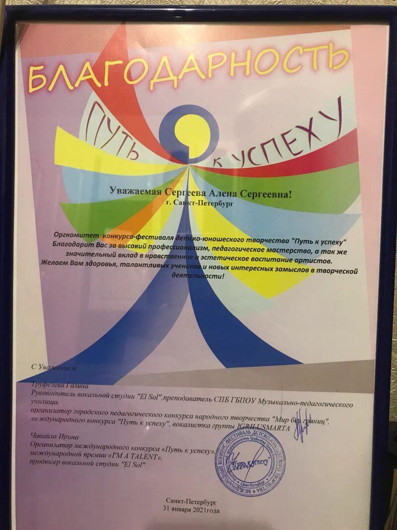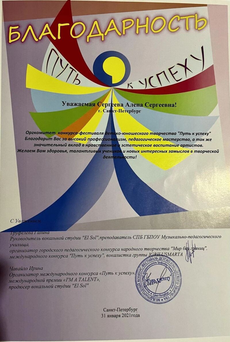 - Благодарственное письмо за подготовку ученика к конкурсу-фестивалю «Путь к успеху», 2021 г.