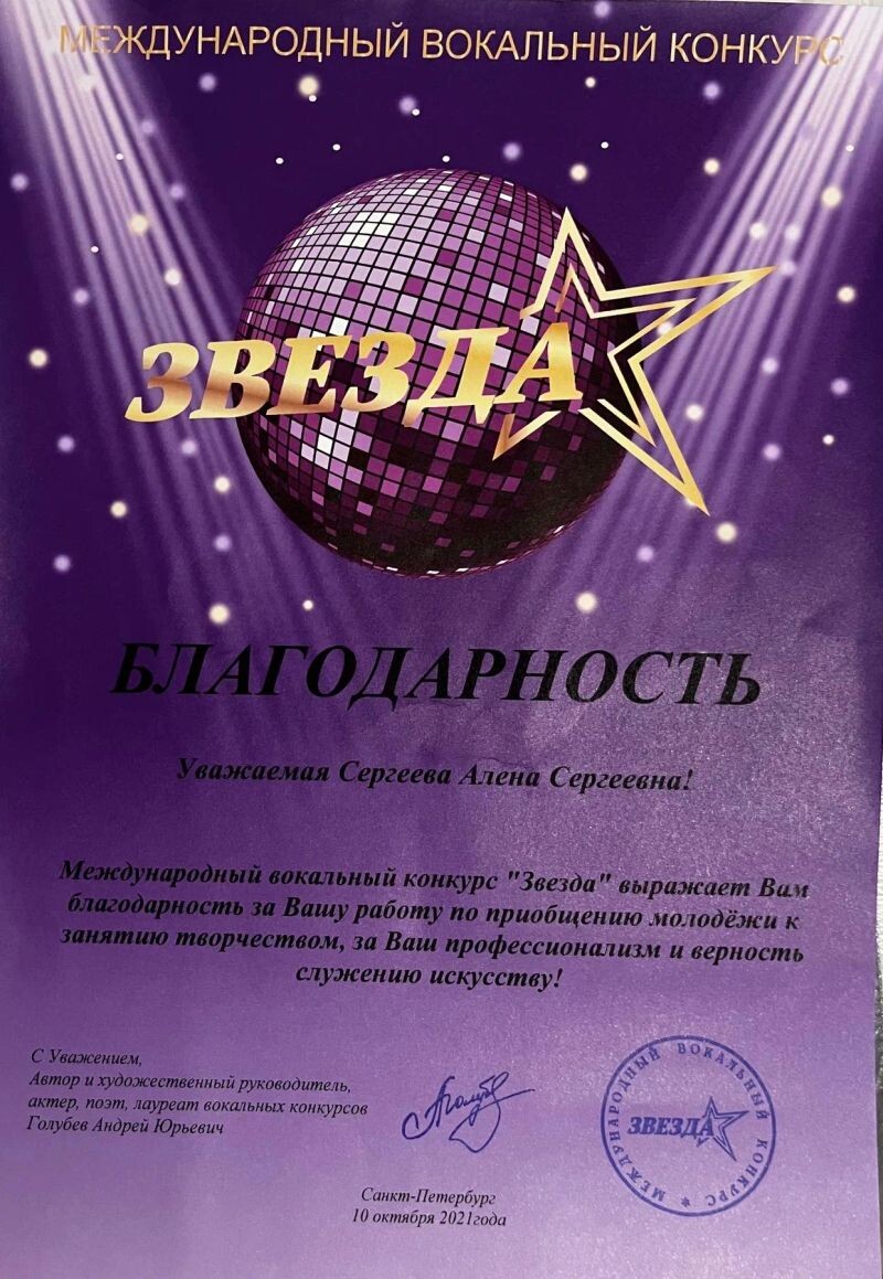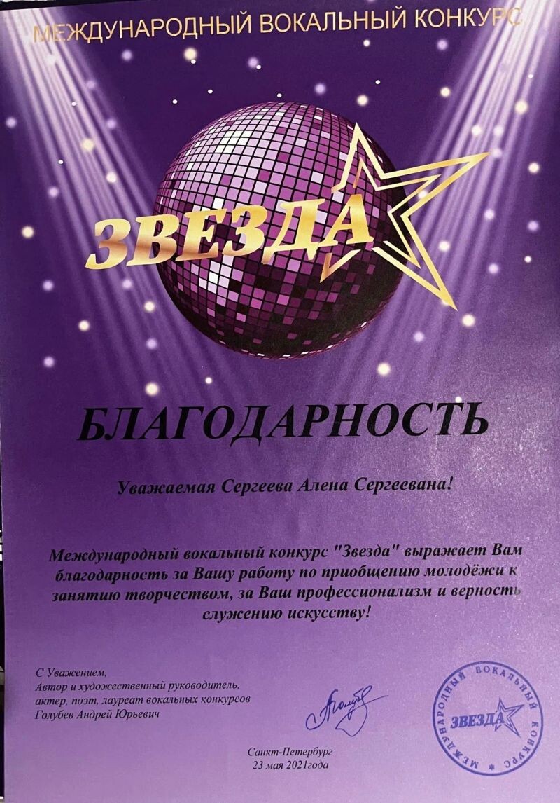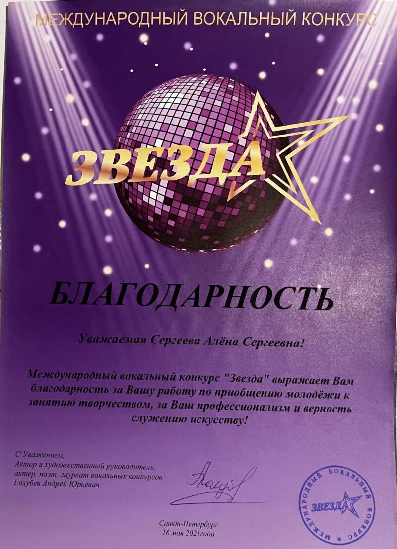 - Благодарственное письмо за подготовку ученика к международному вокальному конкурсу «Звезда», 2021 г.