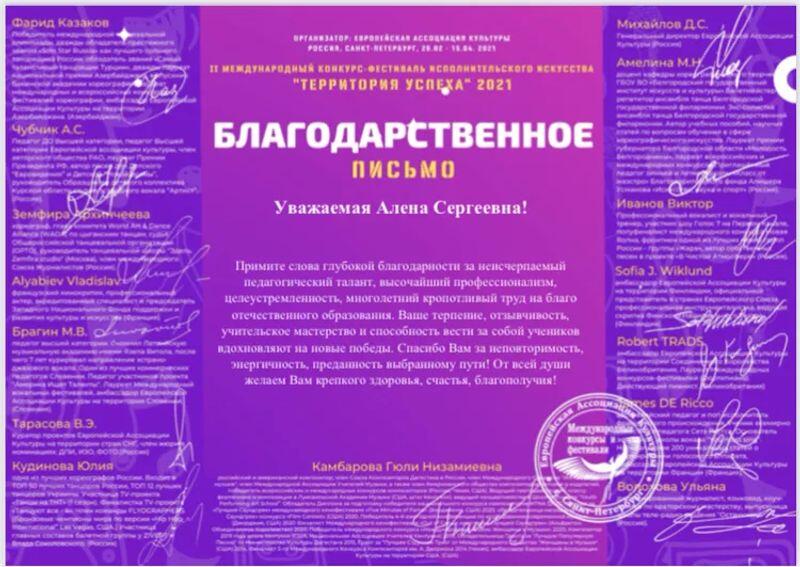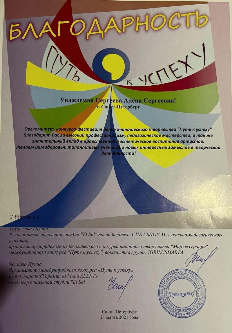 - Благодарственное письмо за подготовку ученика к международному конкурсу-фестивалю «Путь к успеху», 2021 г.