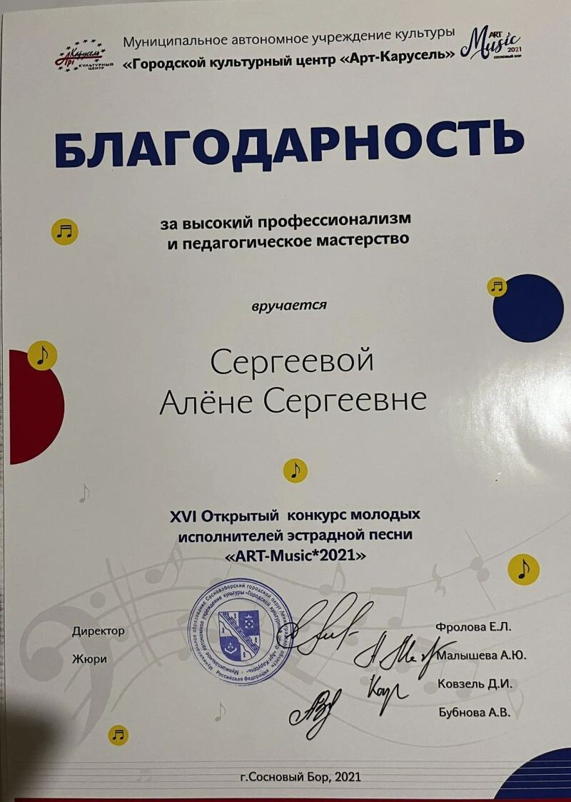 - Благодарственное письмо за подготовку ученика к XVI Открытому конкурсу молодых исполнителей эстрадной песни «Art music 2021».