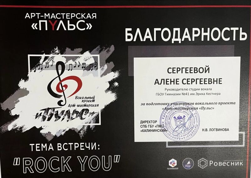 - Благодарственное письмо за подготовку участников вокального проекта «Арт-мастерская "Пульс"», 2022 г.