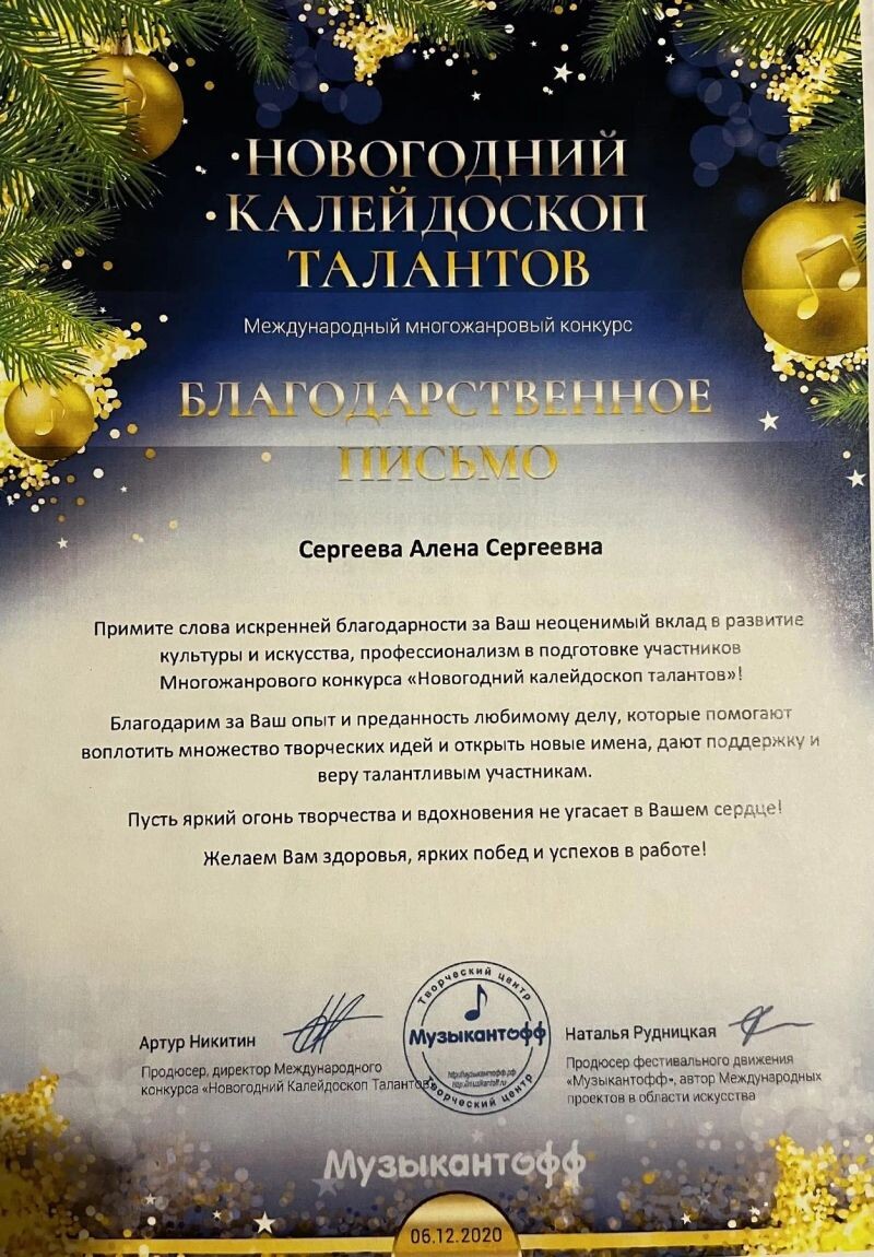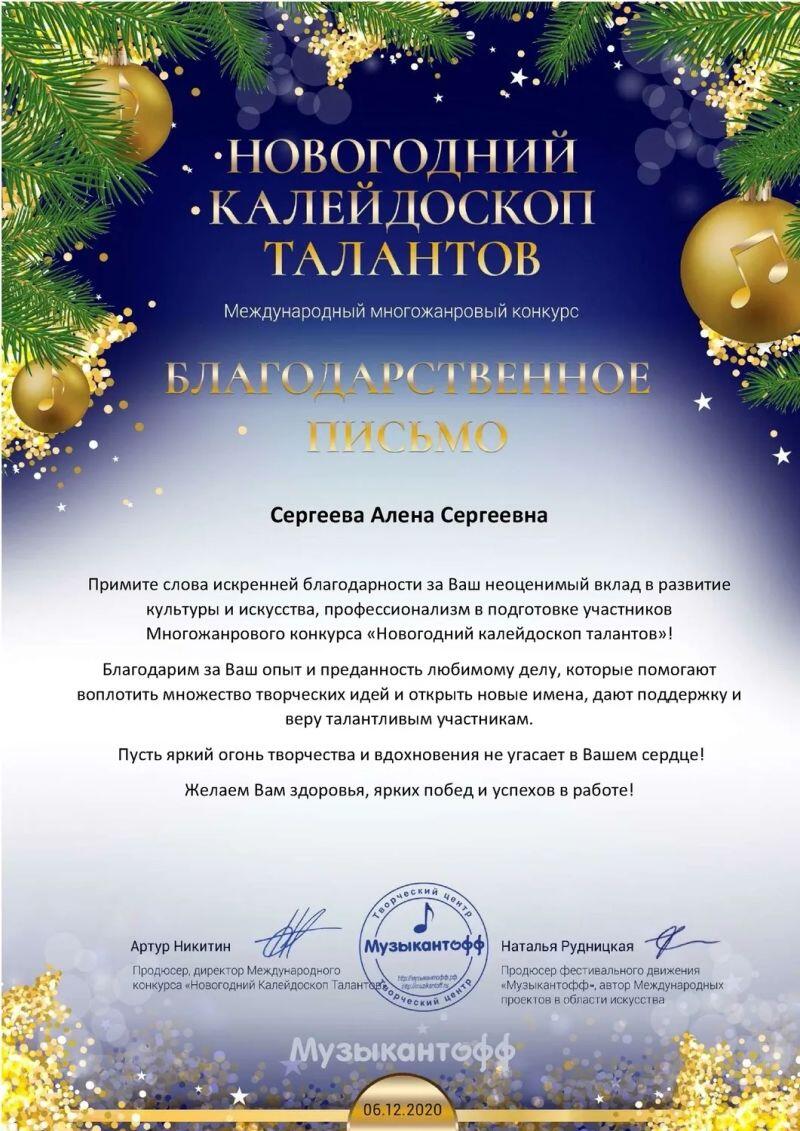 - Благодарственное письмо за подготовку ученика к международному многожанровому конкурсу «Новогодний калейдоскоп талантов», 2020 г.