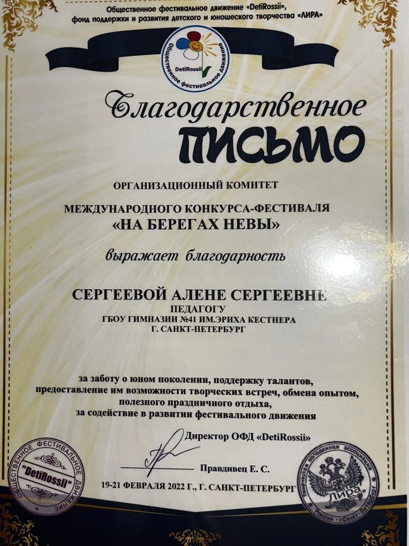 - Благодарственное письмо за подготовку ученика к международному конкурсу-фестивалю «На берегах Невы», 2022 г.