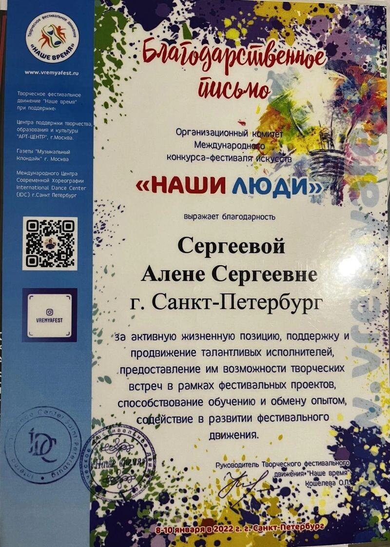 - Благодарственное письмо за подготовку ученика к международному конкурсу-фестивалю искусств «Наши люди», 2022 г.