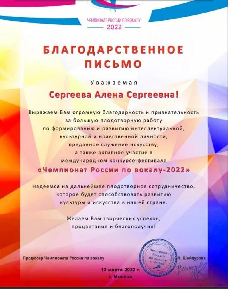 - Чемпионат России по вокалу, благодарственное письмо, 2022 г.