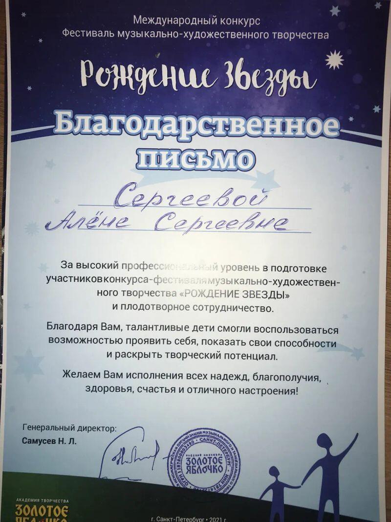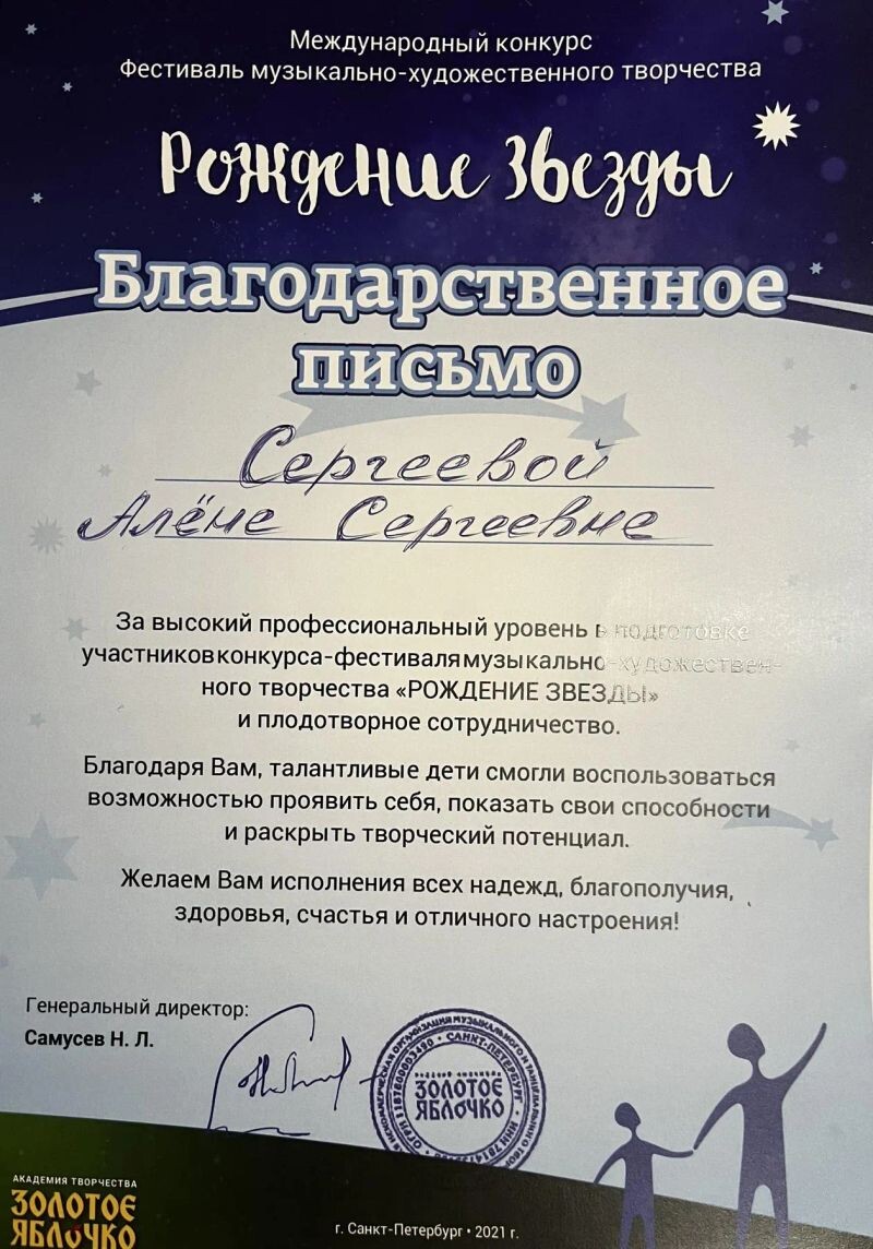- Благодарственное письмо за подготовку ученика к международному конкурсу фестивалю музыкально-художественного творчества «Рождение звезды», 2021 г.