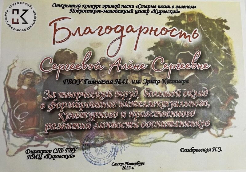 - Благодарственное письмо за подготовку ученика к открытому конкурсу зримой песни «Старые песни о главном», 2022 г.