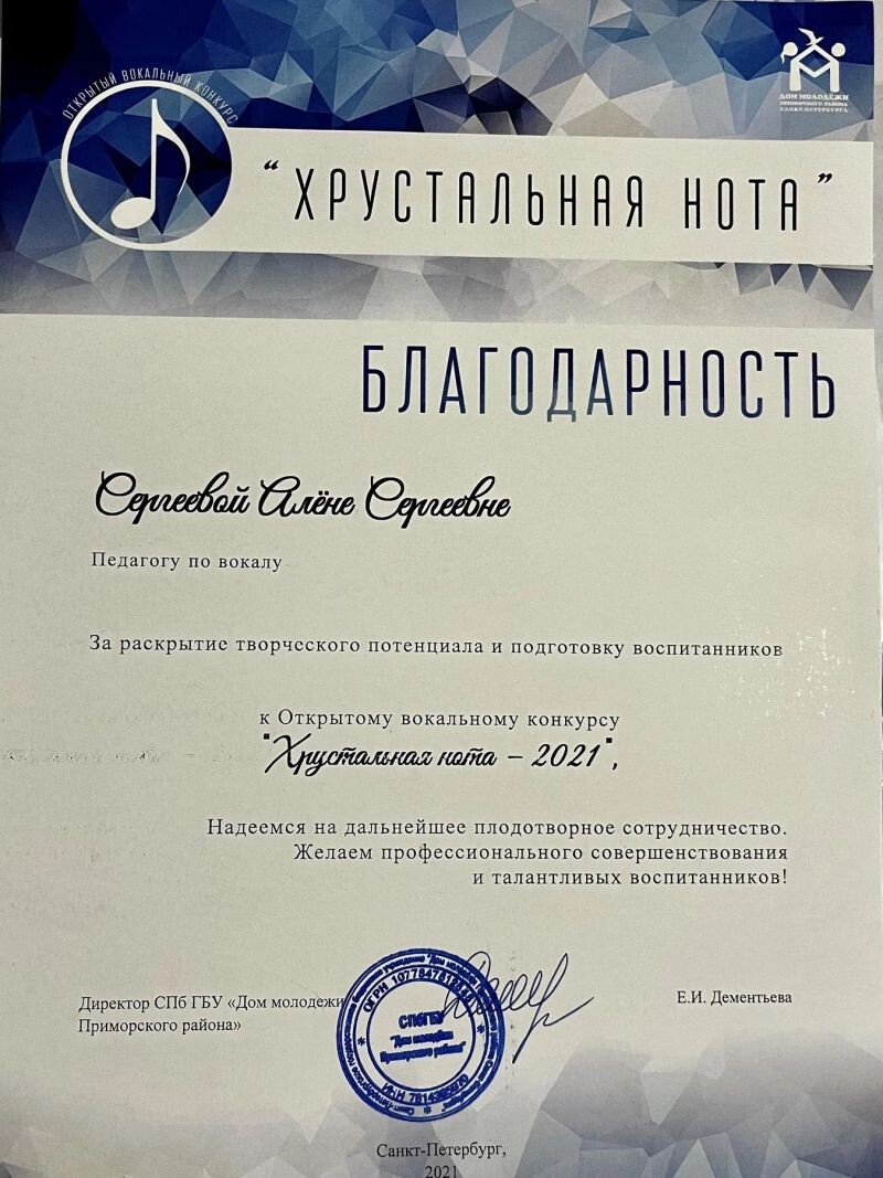 - Благодарственное письмо за подготовку ученика к открытому вокальному конкурсу «Хрустальная нота», 2021 г.