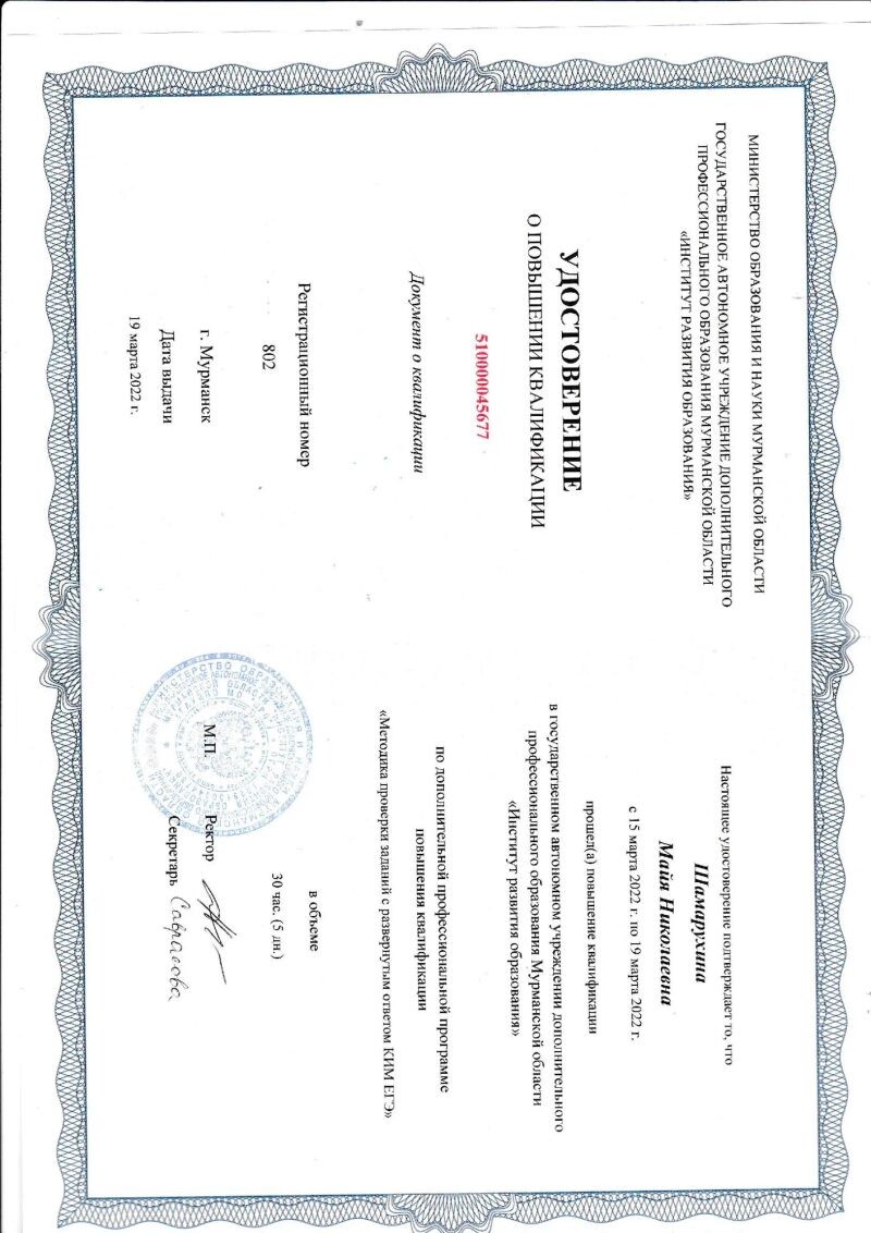 - ГАУ ДПО «Институт развития образование», программа «Методика проверки заданий с развёрнутым ответом КИМ ЕГЭ», 2022 г.