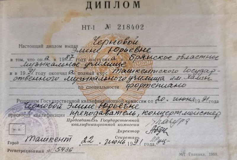 - Брянское областное музыкальное училище, фортепиано, 1987–1991 гг.