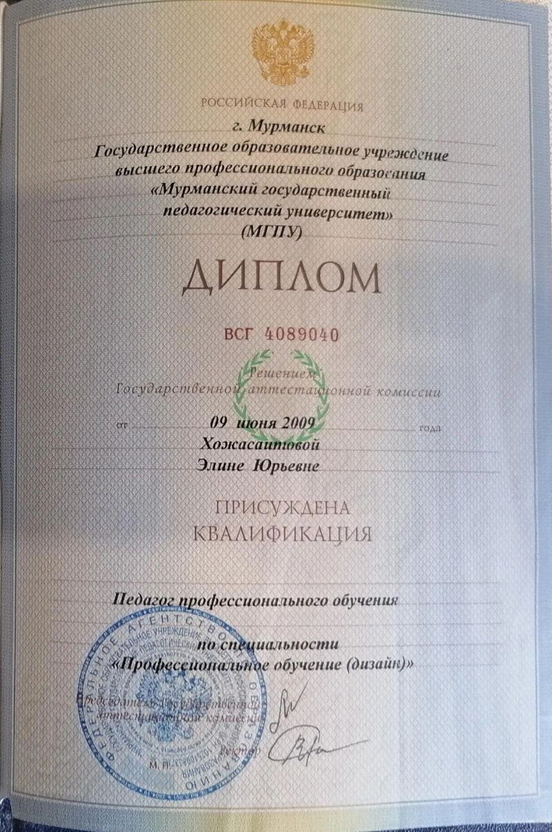 - Мурманский государственный педагогический университет, педагог профессионального обучения, 2004–2009 гг.