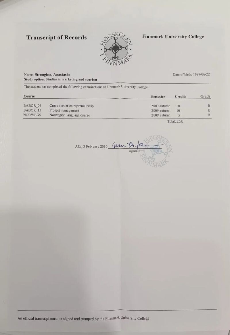 - Участие в программе студенческого обмена. Finnmark University College (Norway)/ Study option: "Studies in marketing and tourism" (с 2009 г.).
